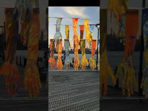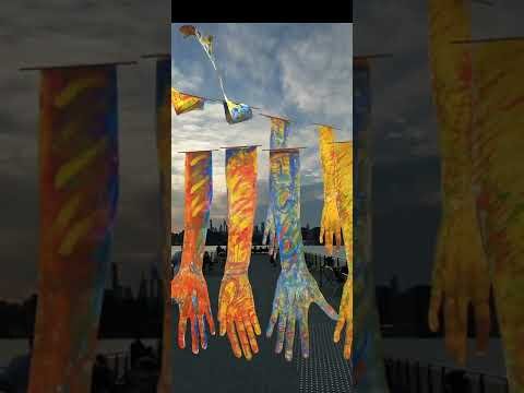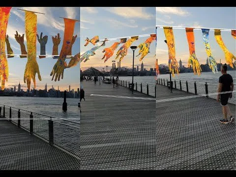 Day's Not Over Yet Augmented Reality Art Installation with Giant Hands over Williamsburg Pier