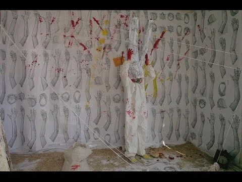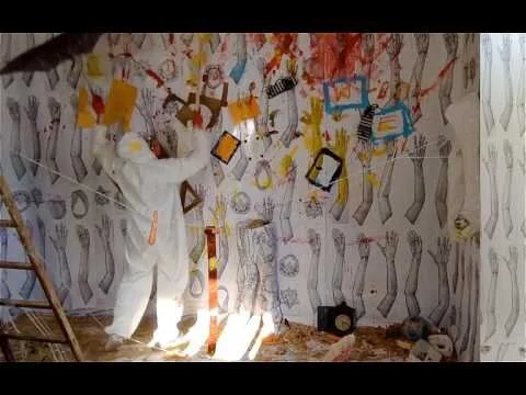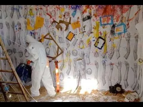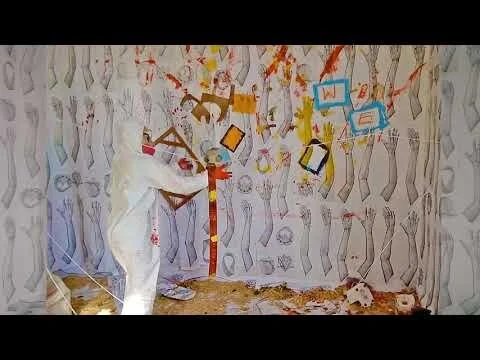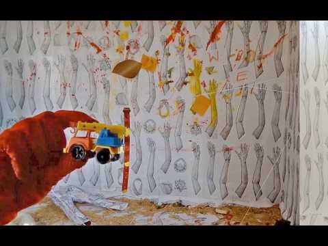 Ingredients of a Subway Car room-size installation with hands wallpaper(before the performance).